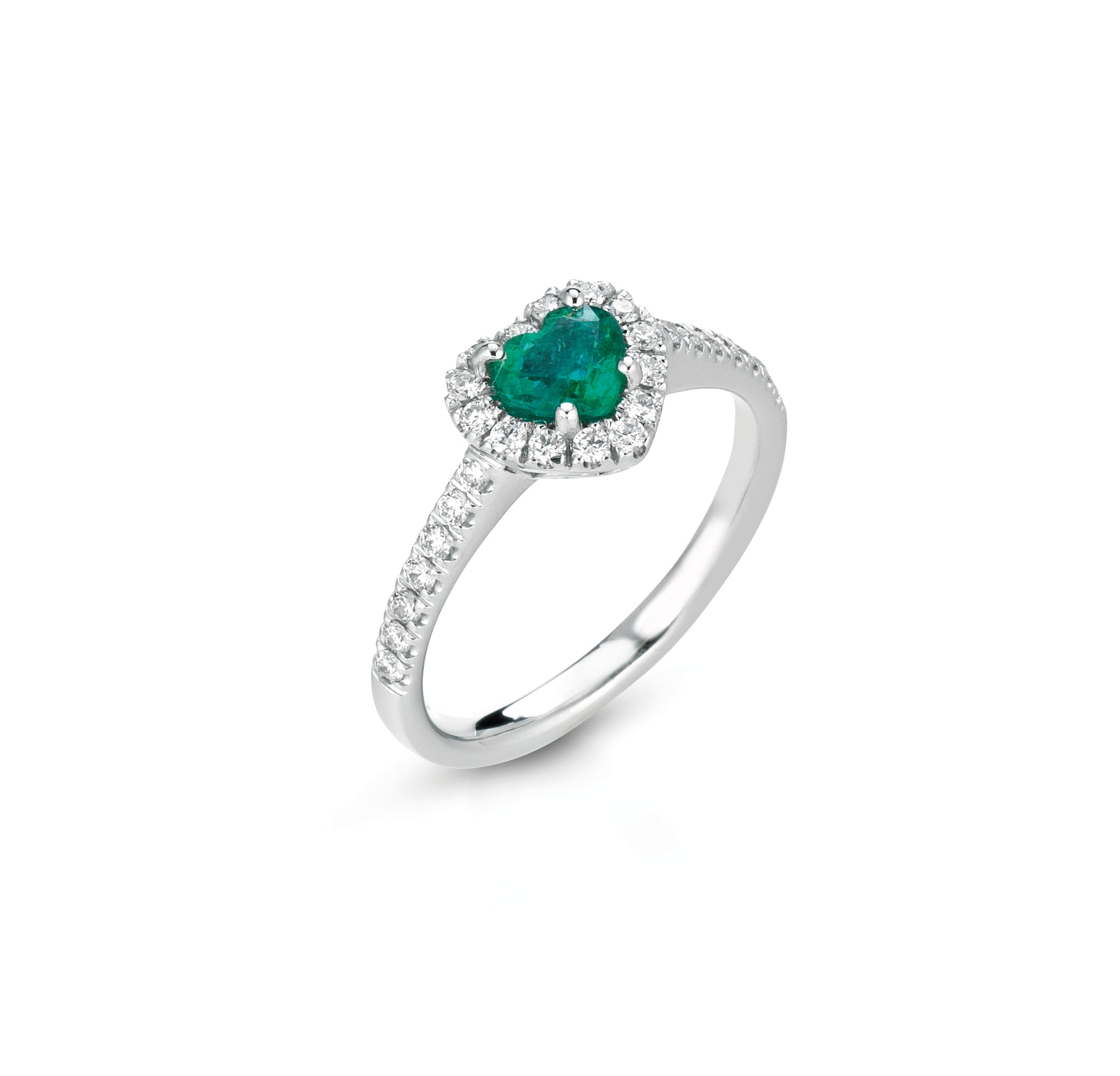 Anello in oro bianco 18kt 750/000 (gr.3,10) composto da uno smeraldo naturale di taglio cuore del peso di ct0.50 e da vari diamanti naturali di taglio tondo brillante del peso complessivo di ct0.30 di colore bianco extra " F" di purezza vs
